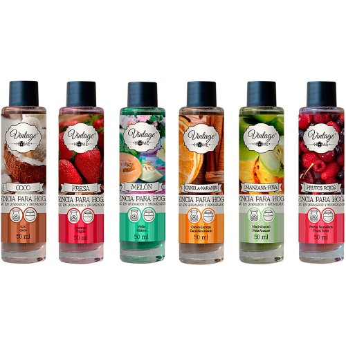 Compre o nosso pack especial VINTAGE nº9 com seis essências para humidificador e queimador: coco, morango, melão, canela/laranja, maçã/ananás, frutos vermelhos